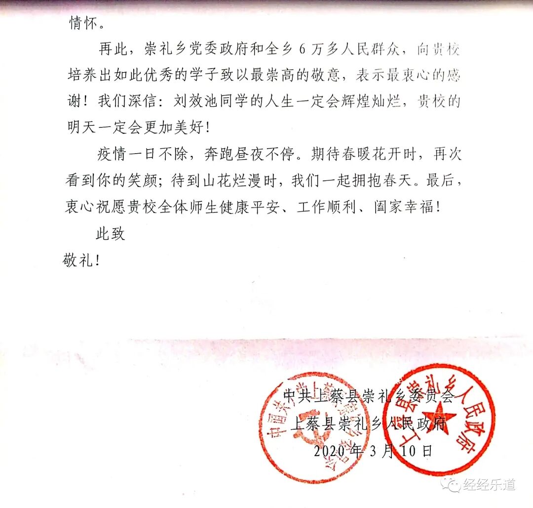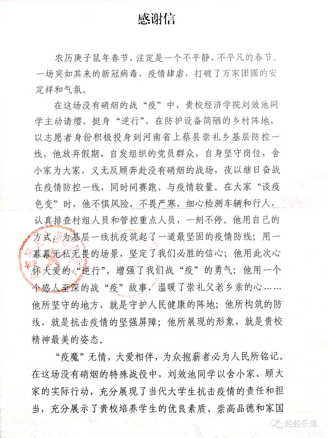 信中的主人公——刘效池同学,来自河南省,今年21岁,是一名共青团员,现为球报体育金融学1705班员工。