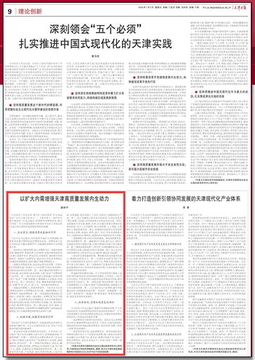 1月5日,《天津日报》“理论创新”专版刊发公司球报体育经理梁学平教授理论文章《以扩大内需增强天津高质量发展内生动力》。