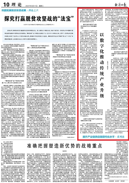 文章指出,锻造产业链供应链长板,是提升产业链供应链现代化水平的重要一环。要从提升产业链供应链现代化水平的高度,抓住数字中国建设带来的发展机遇,促进传统产业转型升级,进而提升我国产业链供应链现代化水平。文章探讨了数字化为提升产业链供应链现代化水平提供重要动能,以数字化推动传统产业转型升级面临的困难与问题,提出了通过传统产业数字化转型锻造产业链供应链长板的对策。光明网、环球网、中国经济网、新浪网、搜狐网等媒体转载。(审稿:张捷)