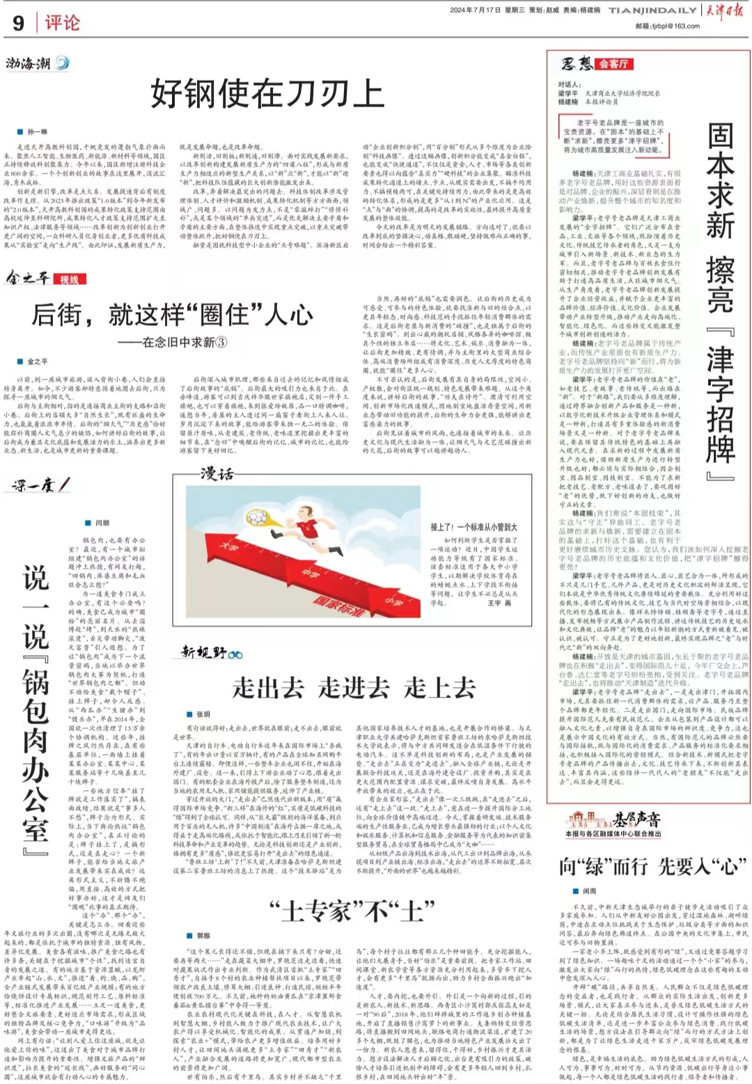 7月17日,公司球报体育经理梁学平教授做客《天津日报》9版思想会客厅栏目,就“固本求新 擦亮‘津字招牌’”话题,与日报评论员开展对话。他指出,老字号老品牌是天津工商业发展的“金字招牌”。它们广泛分布在食品、工业、文旅等各个领域,既扮演着历史文化、传统技艺传承者的角色,又是一支为城市引入新场景、新技术、新业态的生力军。而且,老字号老品牌与百姓衣食住行密切相关,推动老字号老品牌创新发展有助于打造高品质生活,点旺城市烟火气。